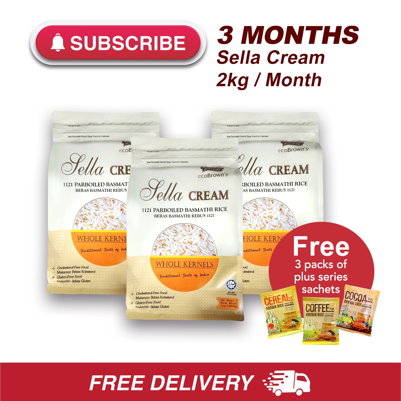- Free Delivery is provided for ecoBrown's Sella Cream subscription plan, and only appliable in West Malaysia and delivery to one (1) single address only.