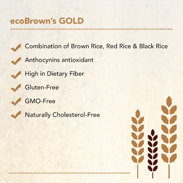 Enjoy even more nutrition with ecoBrown's GOLD. Every bag is packed with dietary fibre, Vitamin B complex, Vitamin E, minerals, phytonutrients, and anthocyanin. You'll love the taste, texture, and colour combination of ecoBrown's GOLD.