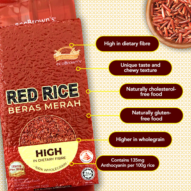 Red rice is another coloured rice variety similar to black and brown rice where only the outer husk is removed from the grain, while the bran, germ, and endosperm are left intact. It has long grains, and the deposition of anthocyanin pigments gives its bran a red colour and a rosy appearance after cooking. Red rice contains a high level of anthocyanins, which are a powerful antioxidant and a good source of phytochemicals, making it have a higher nutritional content when compared to polished rice. Eating ecoBrown’s Red Rice will increase your appetite with the presence of a nutty taste and a chewy texture. The unique characteristics of this rice make it suitable not only for daily local dishes but also for international cuisine. Switch over to red rice, which is a better choice for your healthy lifestyle.